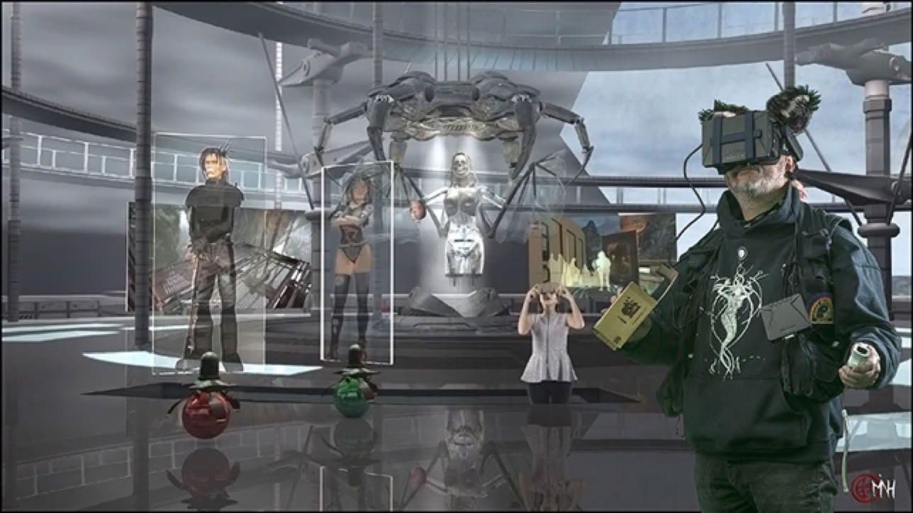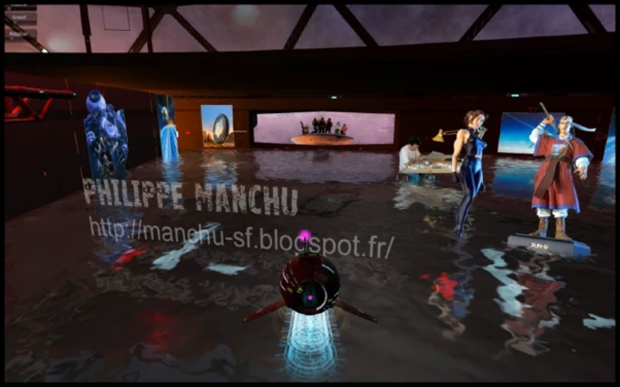 Avec des références à Bernard Szajner, Philippe Caza, Hubert de Lartigues, Philippe Manchu, Cyberesthésie... l'ENSAD... Alien... Second-Life.. les opens-sims... le cybersexe... la Science-Fiction... Unity3D, Unreal Tournament, Mo5 ( Philippe Dubois ) Maurice Benayoun, CNAM, Juan le Parc, Marshall Mc Luhan (Le Message c'est le medium), Michel Tourlière, Michel Onfray, Moebius, Christian Vander (Magma) pilote, métal hurlant, Leonard de Vinci, L'E.learning, Pedagogie augmentée. Ars Memorativa, Virtual Valery, macplaymate, Mike Saenz, Teledildonic, Empathie...Serious Game